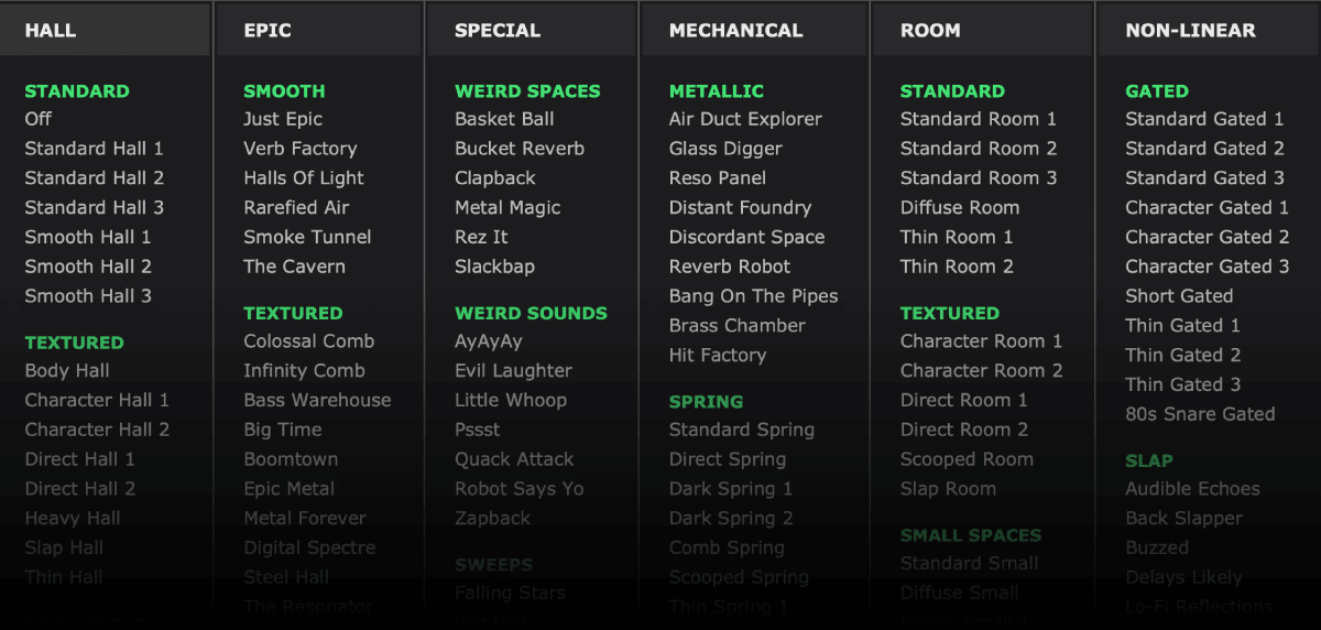 ReverbShaper gives you 127 fantastically diverse reverb types, from lush rooms and halls to shimmering vintage plates, epic ambiences, old-school spring units, and classic gated 'verbs.